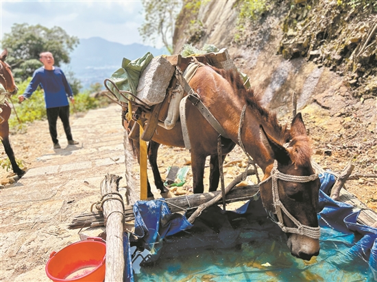 2018年,当地乡贤主动作为,自发筹资修建休闲步道一期工程共1600多级石阶。2020年,乡贤再度筹资修建二期1700多级台阶。在村民们“将石阶铺至天马山顶”的呼声下,去年,三期工程开始筹资,于今年3月20日开工。山路险峻、路途遥远,任何机械均无法到达,他们从广西请来一支专业从事山上运输的马帮队。13日,记者来到天马山,跟随3匹骡子上山,见证它们在这里的最后一次任务。