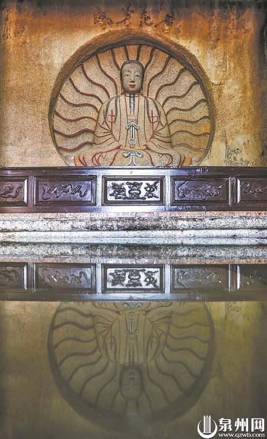 终于,我们到达草庵最出名的地方、泉州世遗景点——全世界仅有一座的摩尼光佛造像。摩尼光佛造像浮雕凿于1339年,高154厘米,宽83厘米,造像双手平放,手心向上置于膝上,盘坐着,脸很圆润,耳朵又大又长,慈眉善目,目光炯炯有神,神态庄严又和善。最特别的是,摩尼光佛的脸、手、身利用花岗岩的不同自然色给人一种神秘感。浮雕身后有着十八道背光,这十八道背光意在象征“光明”,与“清净光明”的偈语对应。造像雕在圆龛内,圆龛直径168厘米,意在象征日形、月形,与摩尼教崇拜日月的义理吻合。龛外有两条记事的崖刻。这些文字记录了草庵摩尼教寺的历史和造像雕刻的年代,是研究泉州明教的第一手资料,也是世界唯一摩尼光佛造像和庵寺建筑年代可考的文字证据。