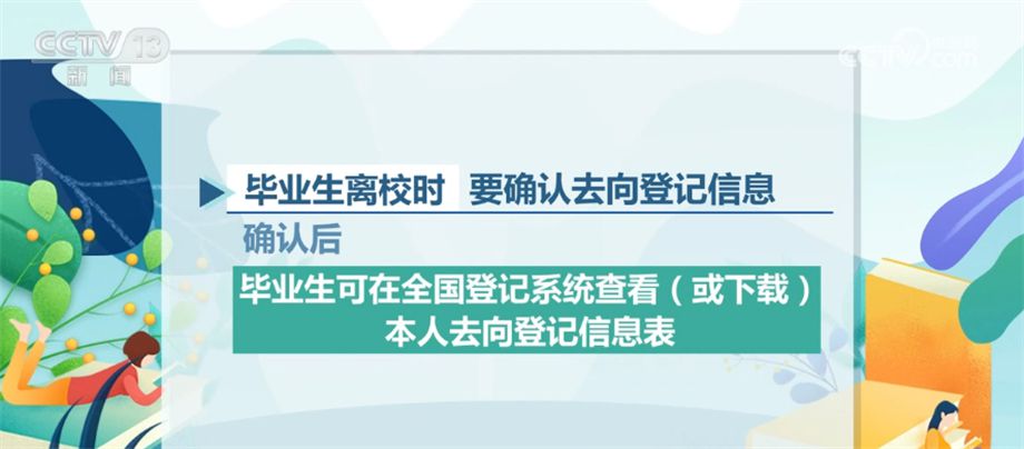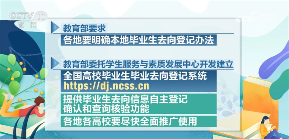 央视网消息:教育部日前印发通知,要求各地各高校规范做好高校毕业生去向登记,按需提供毕业去向登记信息查询核验服务。