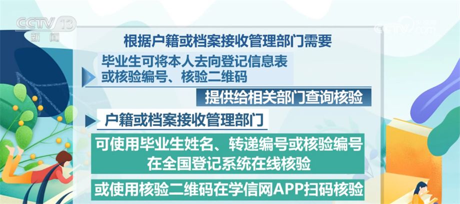 根据户籍或档案接收管理部门需要,毕业生可将本人去向登记信息表或核验编号、核验二维码提供给相关部门查询核验。户籍或档案接收管理部门可使用毕业生姓名、转递编号或核验编号在全国登记系统在线核验,或使用核验二维码在学信网App扫码核验。