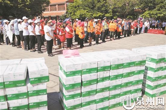 真武庙的现场启动仪式结束后,东南公益和泉州小飞侠志愿服务队的志愿者兵分三路,上街向一线作业人员分发矿泉水。在市区云鹿路,正在修剪绿植的园林工人接过志愿者送的水,连声道谢。在田安路,几名管道工正在烈日下挥汗如雨,志愿者及时送上矿泉水。当天,参与现场服务和送水的志愿者有50多人,包括多名中学生和大学生。