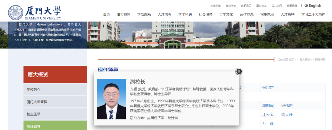 近日,厦门大学网站更新“现任领导”栏目,显示新增副校长方颖。
