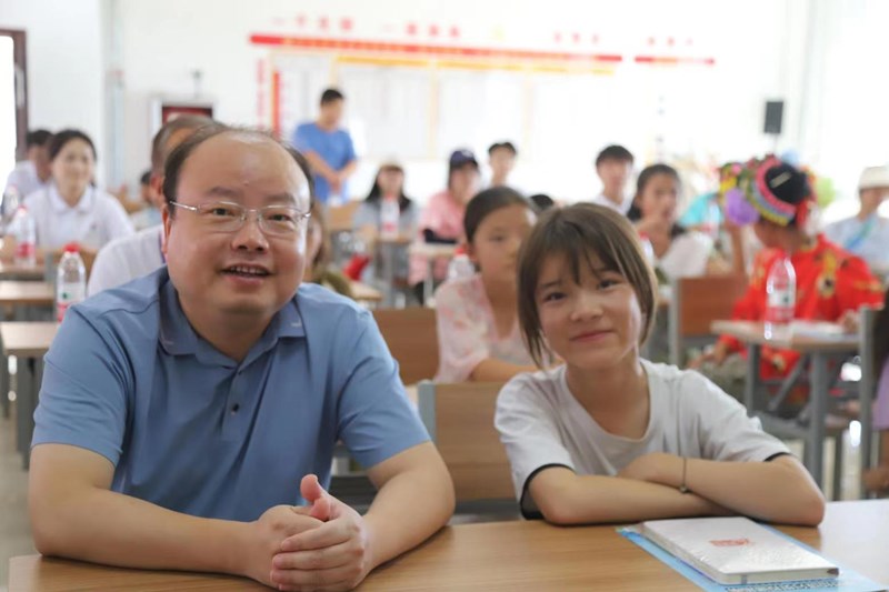 黎明职业大学校长王锋与福宁社区小朋友一起参与公益体验课堂(图片来源:黎明职业大学)