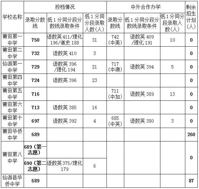 按平潭一中和福建师范大学平潭附属中学普通班向本区招生计划总数的75%划定第一条投档线,为696分。