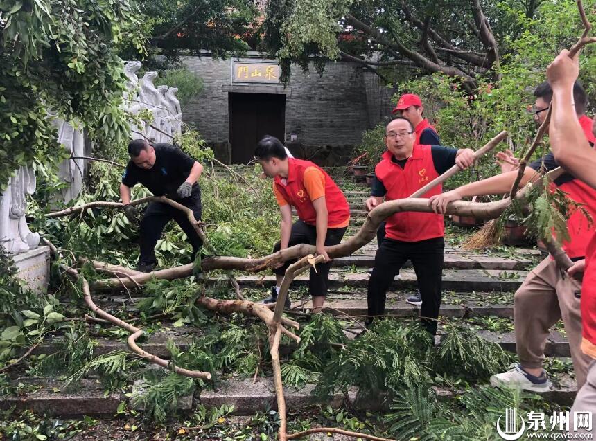 上午,记者在市区北门街、城北路和城西路看到,漳州春天生态园林、开元街道工作人员等20多人,利用重型机械车,对沿路倒伏的树木进行修复,志愿者们用木棍将倒伏树木的树身固定住,并对树根进行加固。下午,记者在市区濠沟墘看到,鲤城海滨街道新门社区联合泉州市贸促会、鲤城区司法局等共建单位志愿者,对辖区背街小巷倒伏树木进行清运,下午共清理了8车落叶、树枝。
