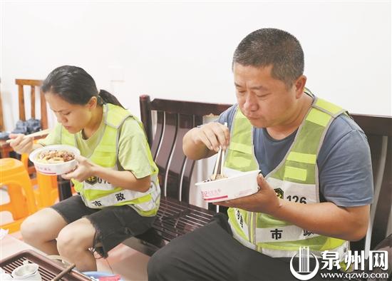 7月29日傍晚6时05分,位于市区花巷的刺桐鲤市政老城区运营部支部里,多名一线抢险人员接过东南公益志愿者送来的爱心餐,津津有味地吃着。这是他们参与抢险工作多日以来,第一次准点吃上晚餐。