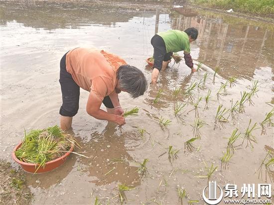 台风过后,南安码头铺前村村民抓紧时间插秧。