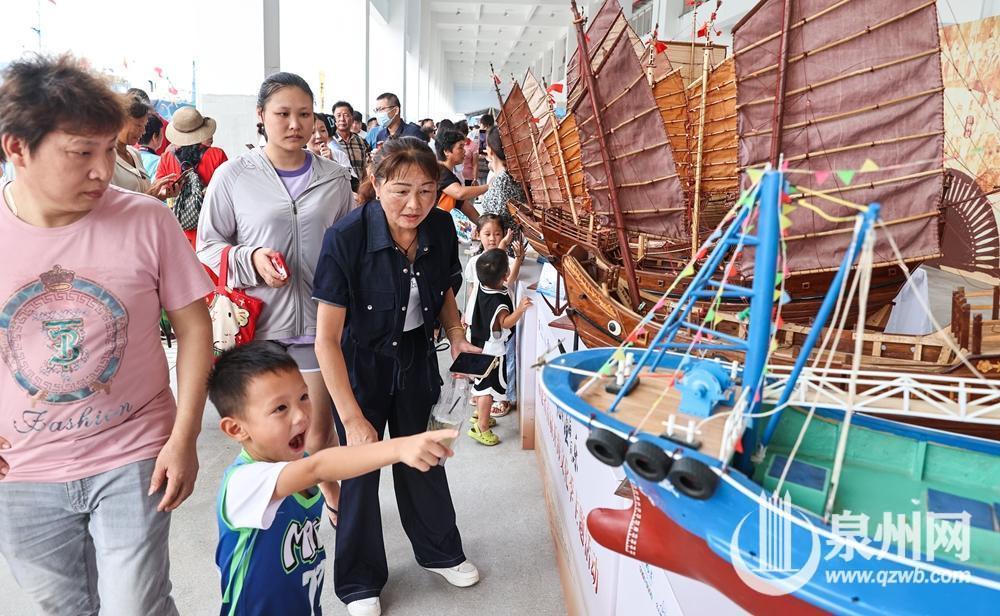 在古代福船制造技艺的展台上,摆放的现代渔船的模型让一个孩子惊奇不已。