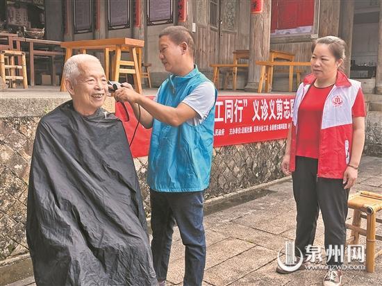 近日,永春呈祥乡开展义诊义剪志愿服务活动,医护人员为居民进行血压、血糖、视力、听力等检查,并针对问题现场解答,提出诊疗方案。理发师志愿者根据老人的个人喜好和要求设计发型后精心修剪,营造文明和谐温暖的村居氛围。图为理发师为老人义剪。(郭芳蓉 刘晓梅 摄)
