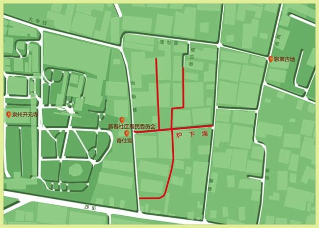 炉下埕,与台魁巷、裴巷纵向交错,北向有一小巷名破古巷,与清军驿相连。