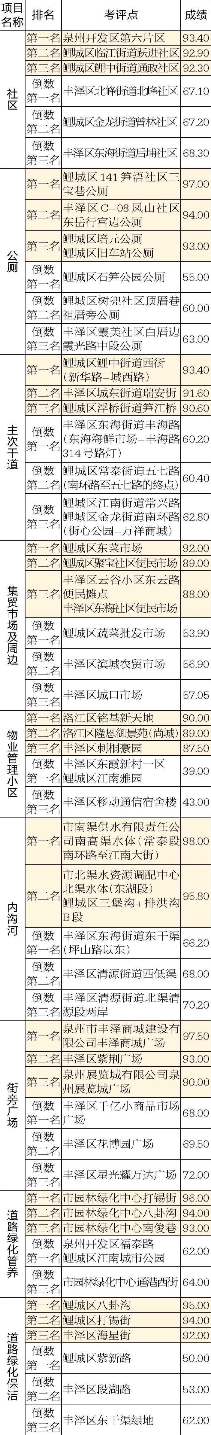 2023年7月份,市城管局考评中心共抽评73个社区、84条主次干道、120个住宅小区、15个街旁广场、46条内沟河、6条江岸带、34座市场、68座公厕、60条道路绿化,共发现问题7345处。各区城市管理综合成绩为:鲤城区82.63分,洛江区81.03分,泉州开发区80.75分,丰泽区80.44分,泉港区79.01分。各项目考评成绩情况如下: