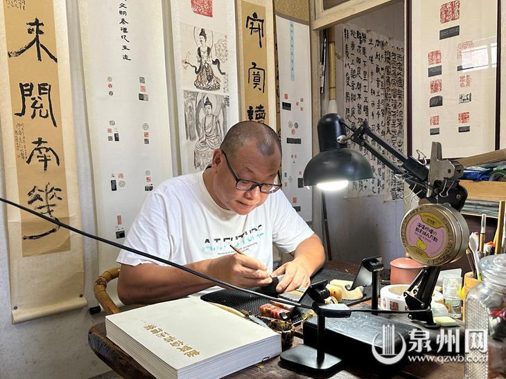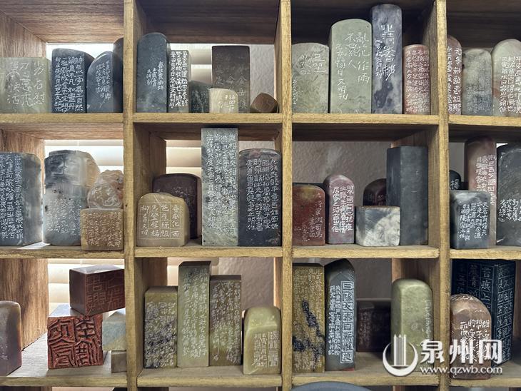 东鲁巷18号是泉州篆刻艺术家张文明的家,张文明说,以前东鲁巷路面比现在要低很多,经过多次整修,路面不断填高,路中井盘、旧民居门面也随之变低。张家二楼是张文明的工作室“澄心斋”,斋内存放张文明创作的大量金石书画,充满书卷气。