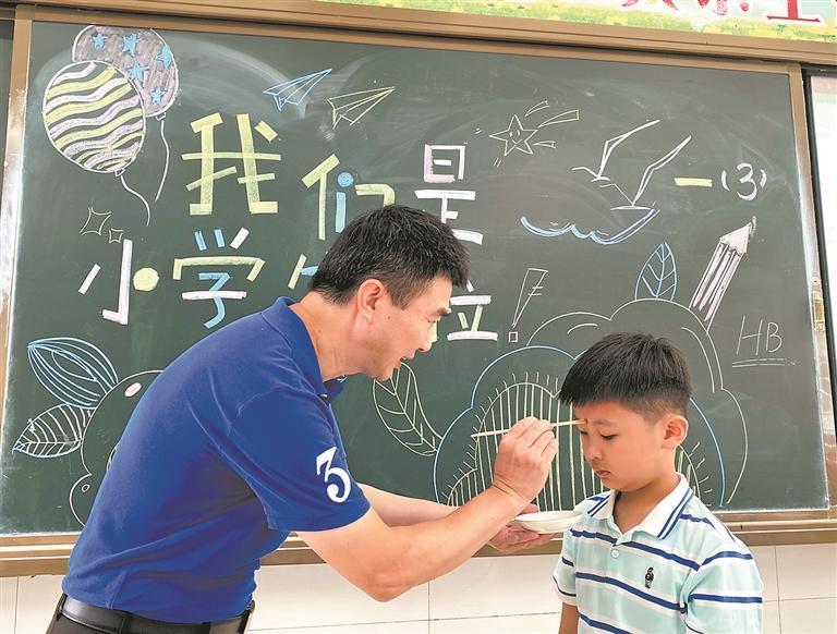 送红蛋点朱砂是泉州市立成小学为新生准备的特别的入学仪式。8月31日,孩子们端坐在教室里,书桌上摆放着用红丝带包扎好的新书本、五颜六色的风车。随后,该校校长走进班级,为每一位孩子送上了红蛋,并点了朱砂,满满的仪式感让孩子们开心不已。