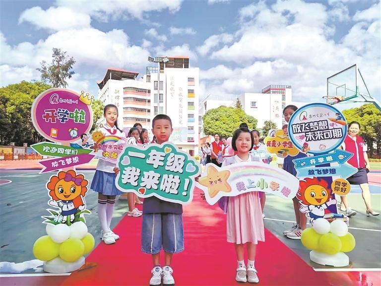 8月30日,泉州市实验小学迎来了一年级新生。为了迎接新同学,校园、教室都布置一新。校门口,竖立着卡通大门,孩子们走上了仪式感满满的红毯;操场上,哥哥姐姐们拿着“放飞梦想 未来可期”“开学啦”等KT板等待新生们打卡合影,精心准备的启智开笔礼让萌新们跃跃欲试;教室里,书本已经装好袋,桌上印有“开学快乐”的气球带来满满的喜悦,孩子们还收到了书签等开学礼物。