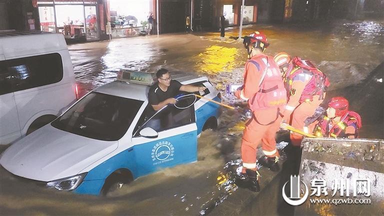 泉州网9月6日讯(记者黄耿煌 陈灵 通讯员林媛 文/图)昨日19时许,南安市洪濑镇连续暴雨,东大路水位逐渐上涨,多名群众、多部车辆被积水围困。