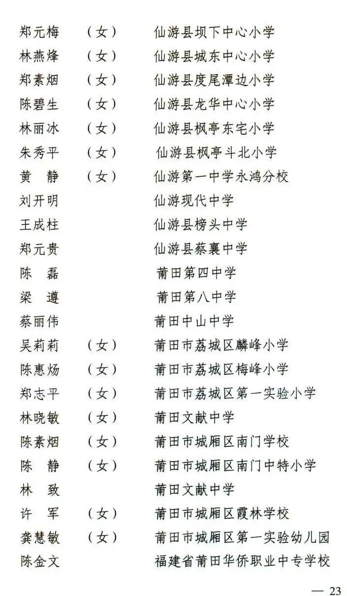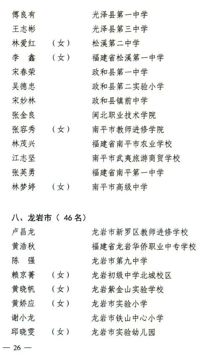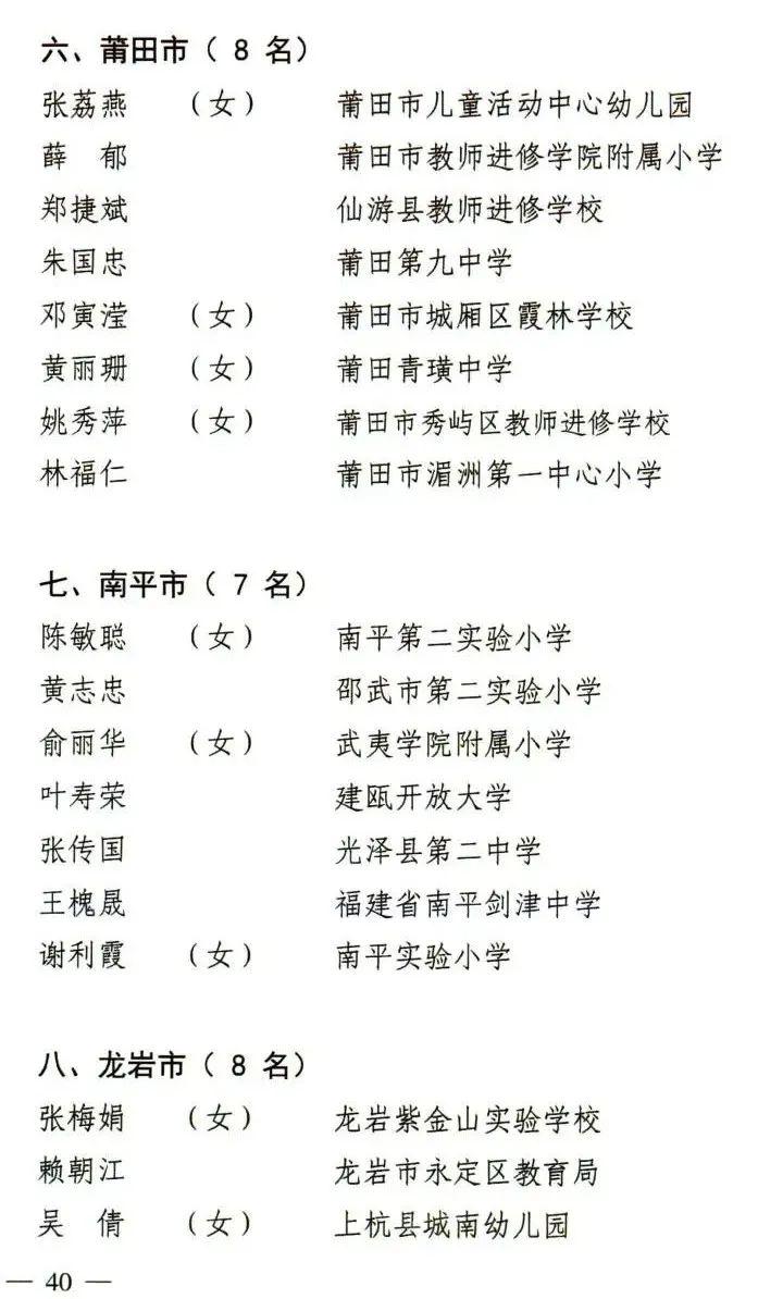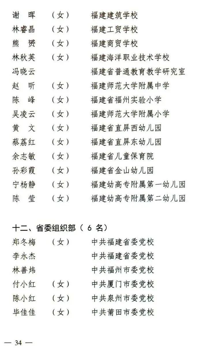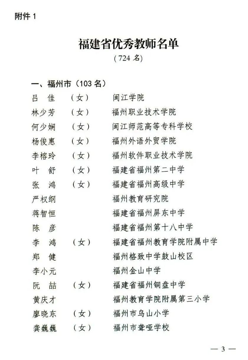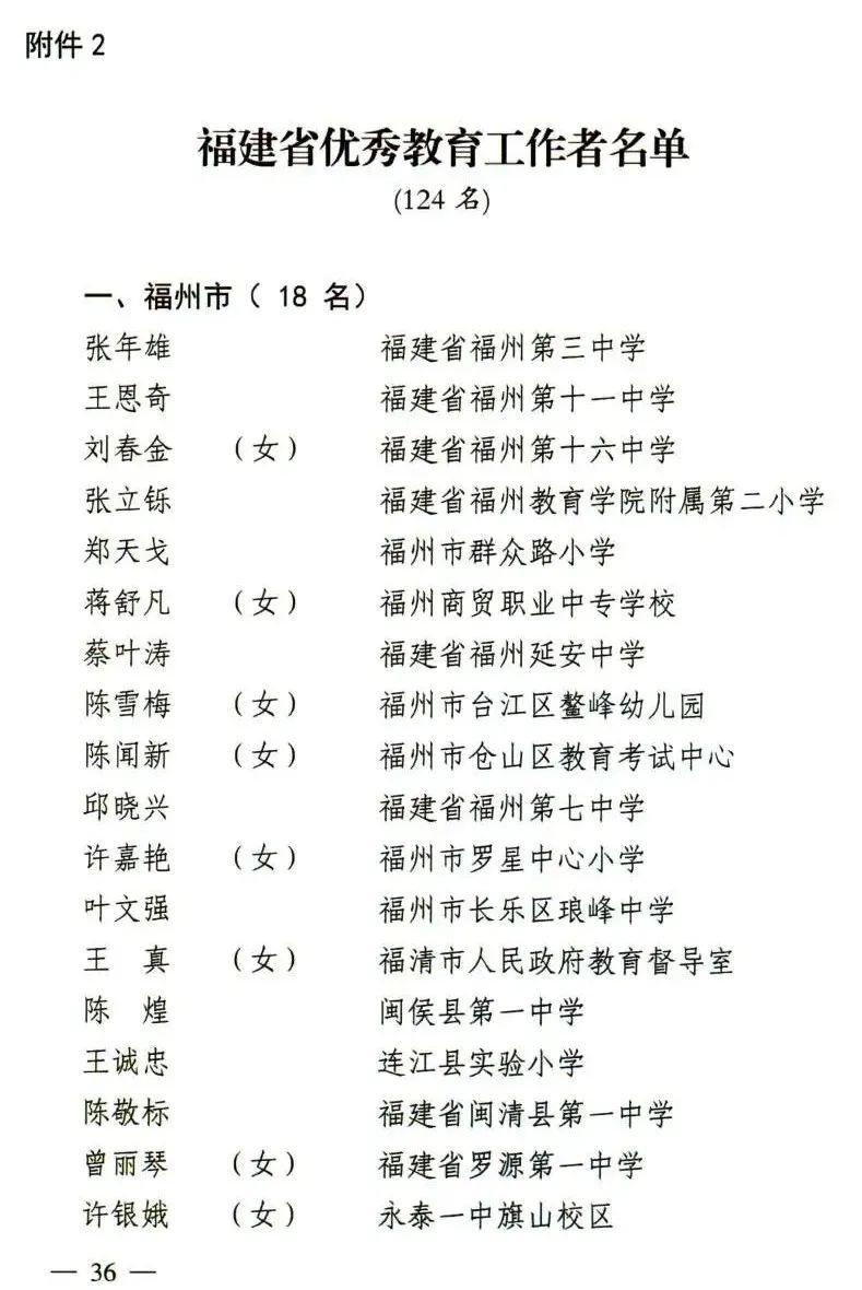近年来,全省广大教师和教育工作者以习近平新时代中国特色社会主义思想为指导,认真学习贯彻党的二十大精神,深入贯彻落实习近平总书记关于教育的重要论述,围绕立德树人根本任务,教书育人,爱岗敬业,无私奉献,涌现出一批优秀教师和优秀教育工作者。为表彰他们的杰出贡献,进一步增强广大教师和教育工作者的荣誉感、责任感,营造尊师重教的良好社会风尚,省人社厅、省教育厅决定,授予吕佳等724人“福建省优秀教师”称号,授予张年雄等124人“福建省优秀教育工作者”称号。