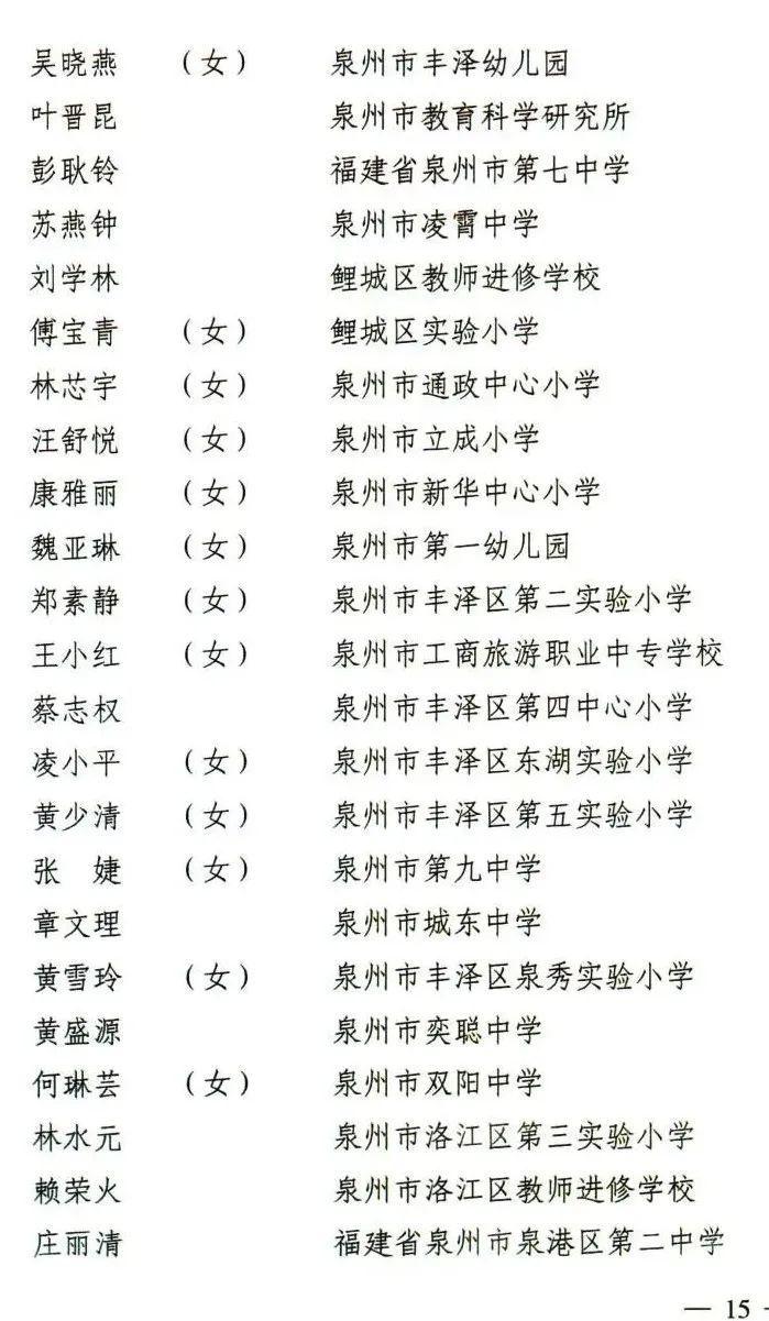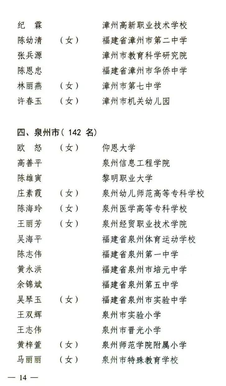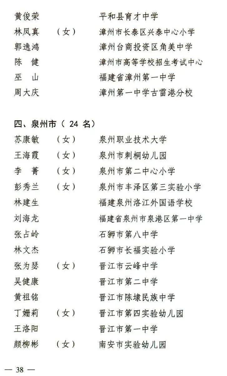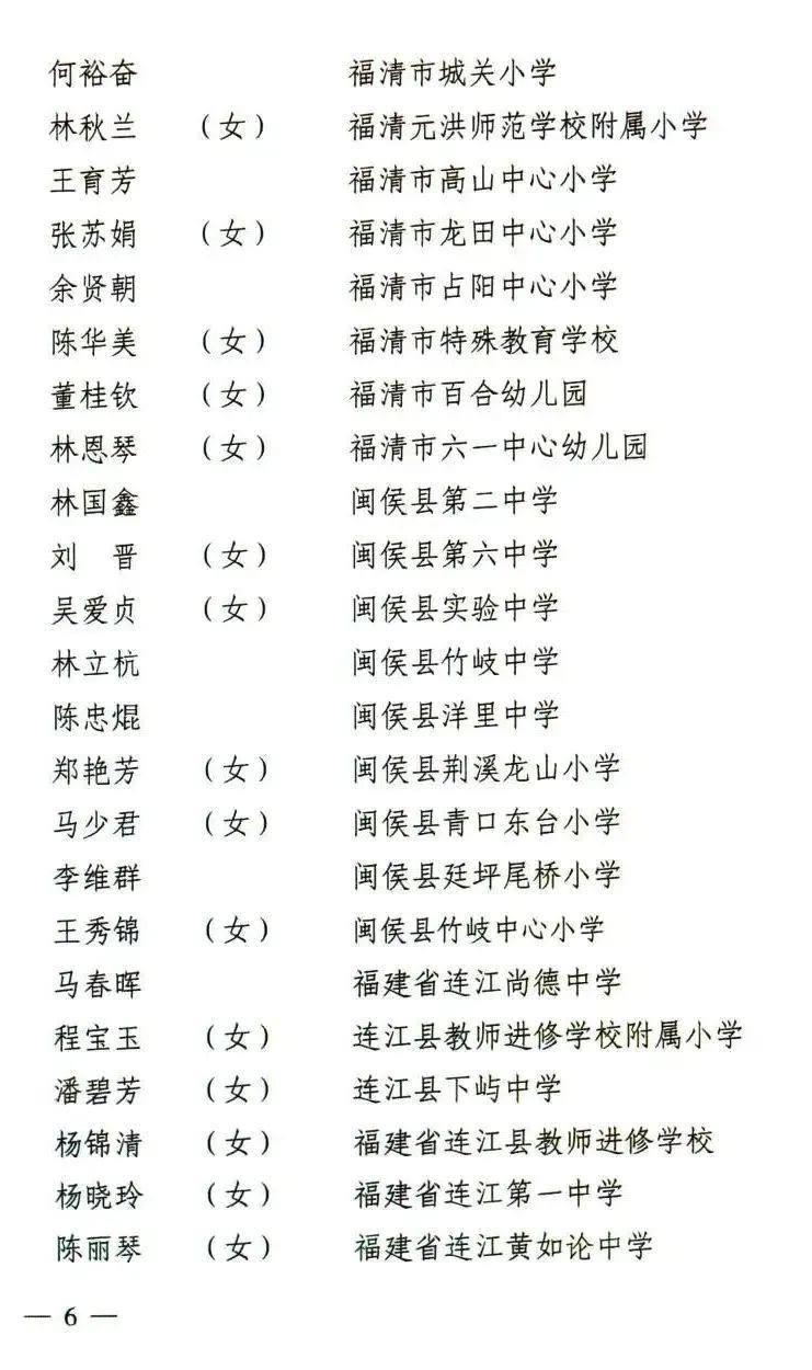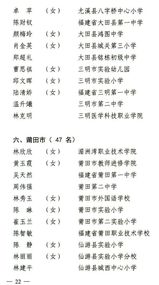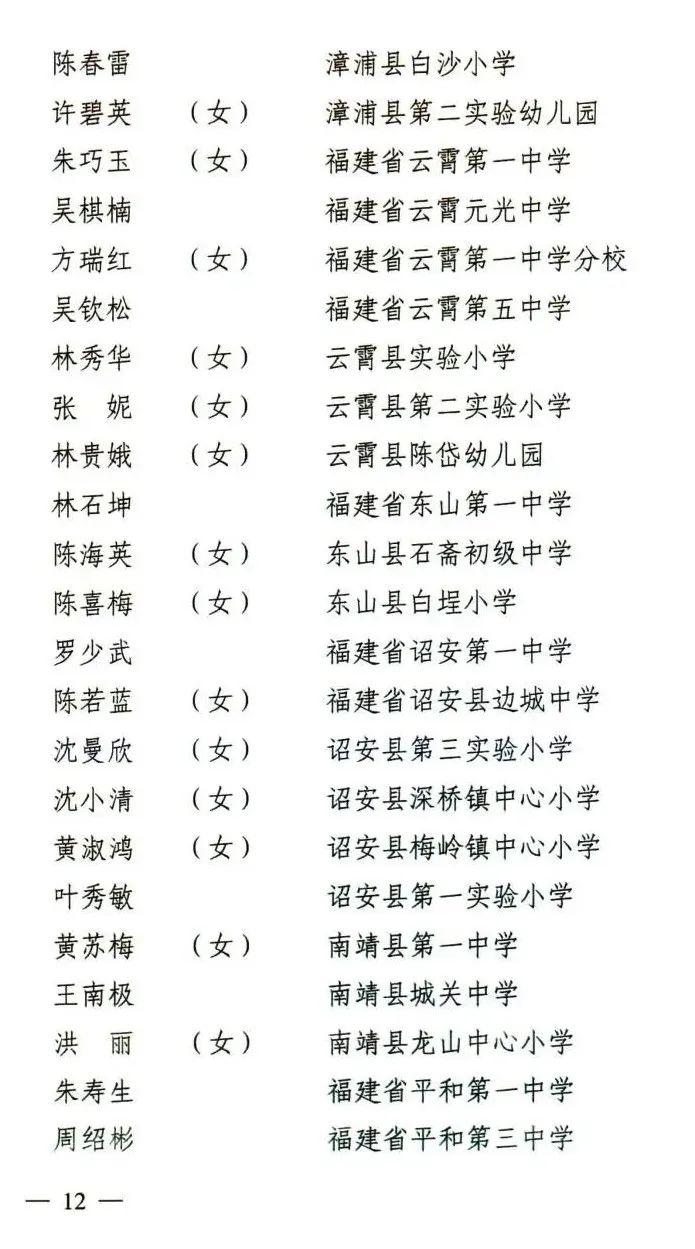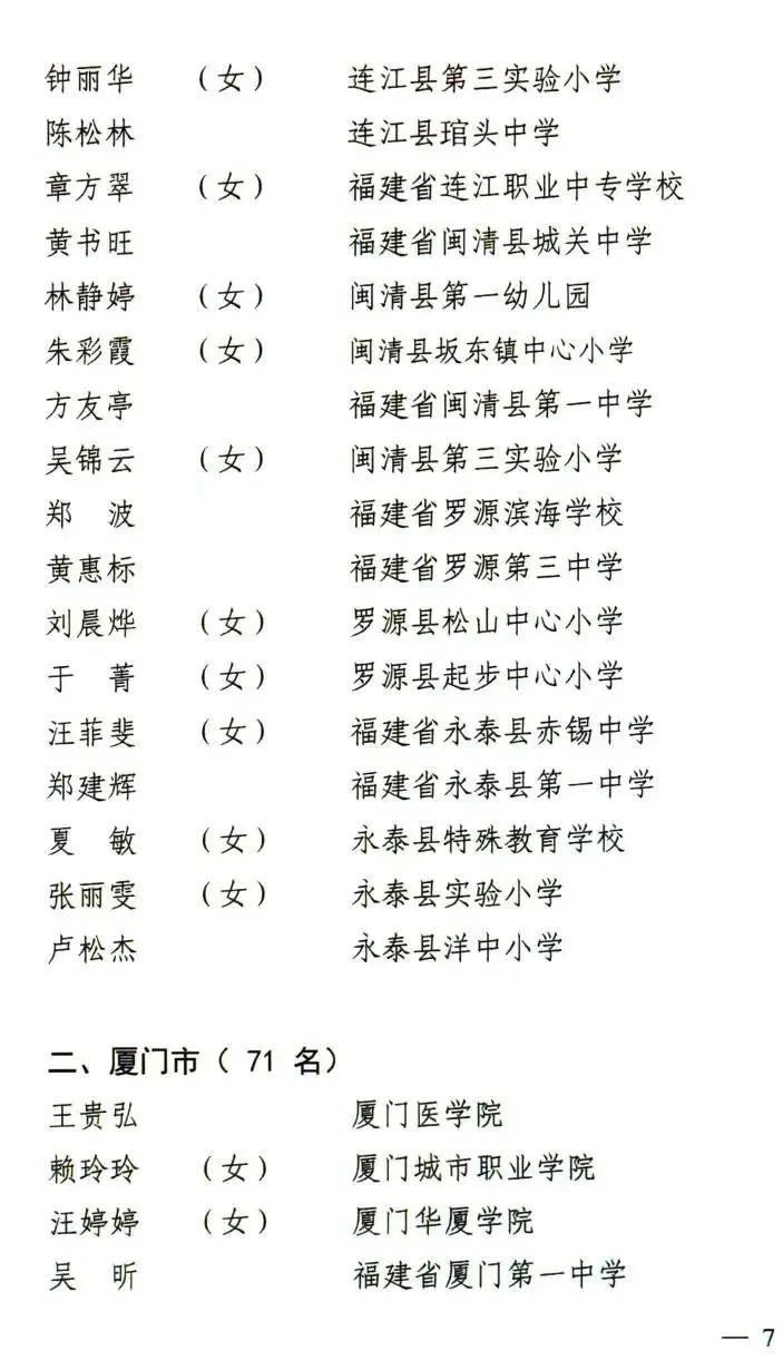 近年来,全省广大教师和教育工作者以习近平新时代中国特色社会主义思想为指导,认真学习贯彻党的二十大精神,深入贯彻落实习近平总书记关于教育的重要论述,围绕立德树人根本任务,教书育人,爱岗敬业,无私奉献,涌现出一批优秀教师和优秀教育工作者。为表彰他们的杰出贡献,进一步增强广大教师和教育工作者的荣誉感、责任感,营造尊师重教的良好社会风尚,省人社厅、省教育厅决定,授予吕佳等724人“福建省优秀教师”称号,授予张年雄等124人“福建省优秀教育工作者”称号。