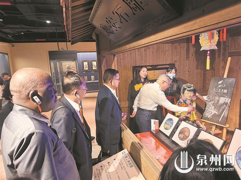 在泉州非遗馆,提线木偶、泉州花灯、永春纸织画等非遗展示,吸引总领事们纷纷驻足观看,并拍照留念。