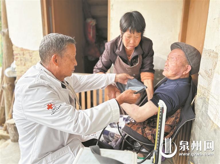 12日10点多,74岁的陈英强背着医药箱来到德化县赤水镇猛虎村75岁瘫痪老人陈老伯家中,为其测量血压,检查身体状况。“高压140,偏高一点,降压药每天要坚持吃。”他叮嘱着陈老伯的妻子。