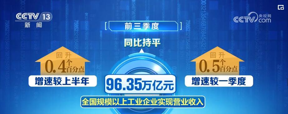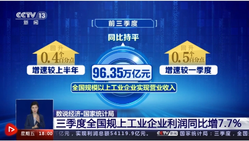 数据一:增长7.7%。国家统计局今天发布数据显示,三季度,全国规模以上工业企业利润同比增长7.7%,由降转增,呈现加快回升态势。前三季度,全国规模以上工业企业实现营业收入96.35万亿元,同比持平,增速较上半年、一季度分别回升0.4和0.5个百分点。前三季度,全国规模以上工业企业实现利润总额54119.9亿元,分季度看,今年以来,工业企业利润逐季回升。