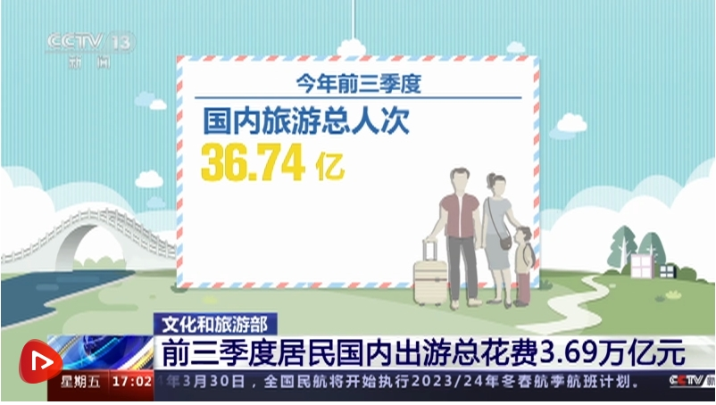 文化和旅游部今天(10月27日)发布2023年前三季度国内旅游数据情况,根据国内旅游抽样调查统计结果,今年前三季度,国内旅游总人次36.74亿,比上年同期增加15.80亿,同比增长75.5%。前三季度,居民国内出游总花费3.69万亿元,比上年增加1.97万亿元,增长114.4%。