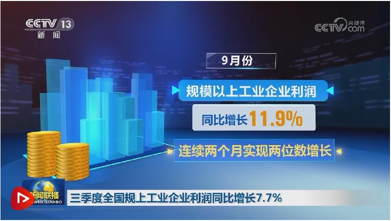 国家统计局今天(10月27日)发布数据显示,今年以来,随着市场需求持续改善,工业生产平稳增长,工业企业营收利润持续恢复向好。其中,三季度规模以上工业企业利润同比增长7.7%,工业企业利润呈加快回升态势。分月看,9月份,规模以上工业企业利润同比增长11.9%,连续两个月实现两位数增长。