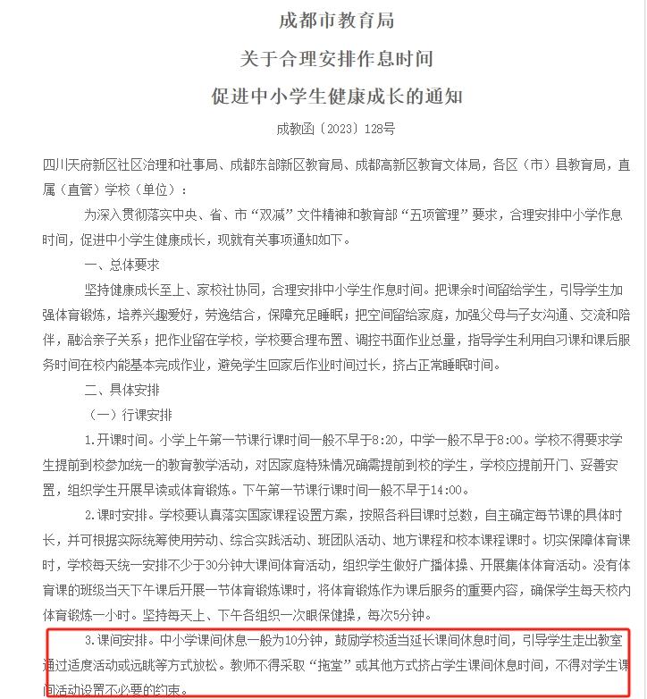 10月31日,成都市教育局发布《关于合理安排作息时间促进中小学生健康成长的通知》,强调把课余时间留给学生,引导学生加强体育锻炼,培养兴趣爱好,劳逸结合。