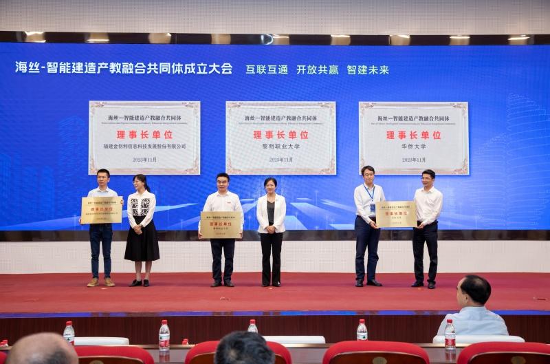 大会举行了海丝-智能建造产教融合共同体成立启动仪式。在仪式上,福建省教育厅副厅长陈丽英,福建省工商业联合会党组成员、副主席叶善青,黎明职业大学党委书记杨远志,华侨大学党委常委、副校长王丽霞、福建省住房和城乡建设厅法规处处长王克非、福建省金创利信息科技发展股份有限公司董事长陈济爱,俄罗斯自然科学院外籍院士、湖南大学教授黄靓共同宣布海丝-智能建造产教融合共同体成立。同时,大会还为共同体理事长单位和副理事长单位集中授牌。