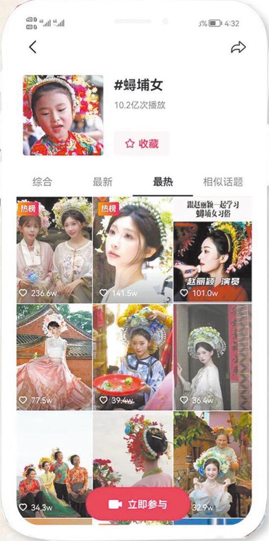 “梳头头髻圆,爱水蟳埔姨。”“阔裤大裾衫,头花插歆歆。”泉州蟳埔女话题在抖音的播放量破10亿啦!
