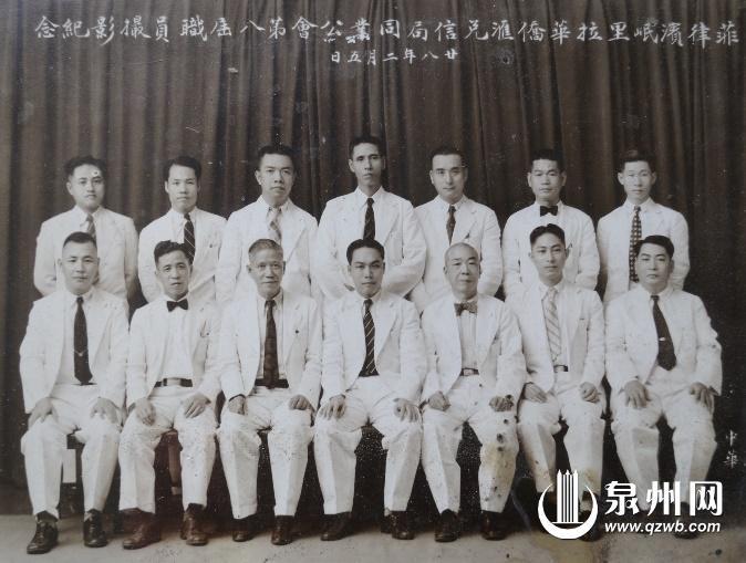 1939年菲律宾岷里拉华侨汇兑信局同业公会第八届职员摄影纪念,后排右一为鲤安信局的东主谢瑞生 (资料图片)