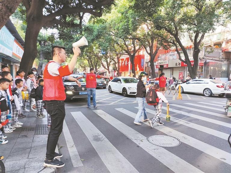 泉州市第三实验小学的正门口位于新华路,紧邻西街,平时车流量大,每到上下学交通高峰期,拥堵的路况与疾驰的车辆令家长们担忧不已。对此,学校成立“华园教育义工团”交通义工组,每天由校领导带领教师协同十来位家长志愿者一起维护交通秩序,为孩子们上下学保驾护航。