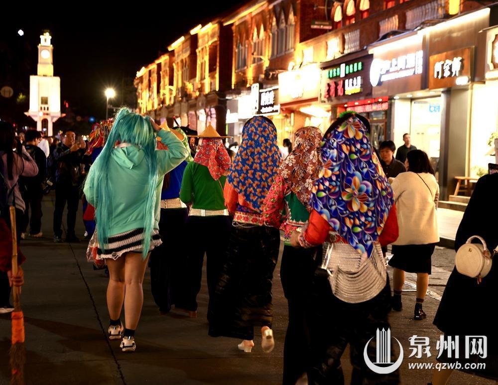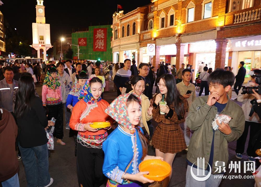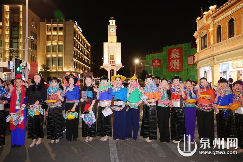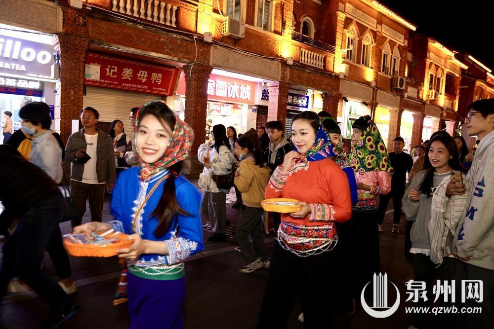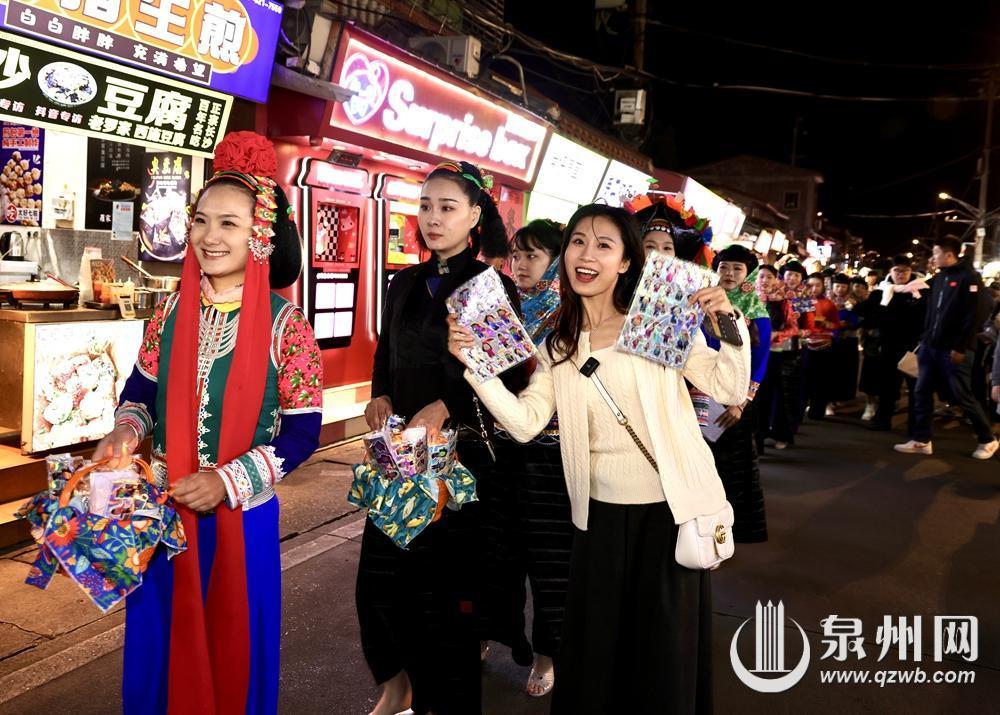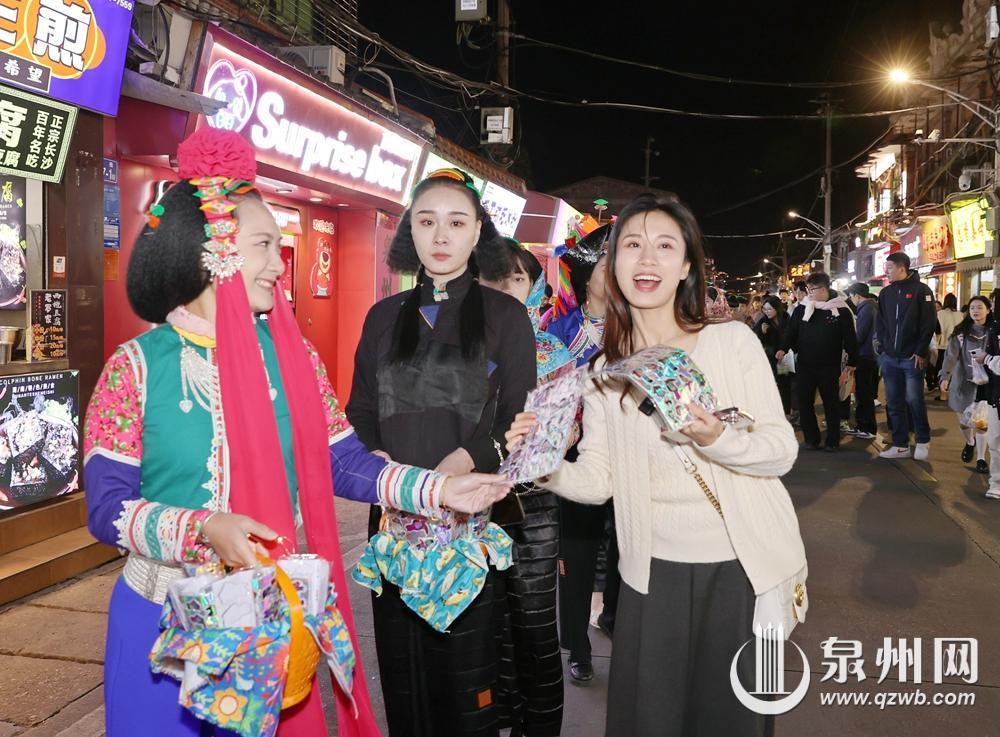 11月24日晚,在泉州西街,十多名身着盛装的惠安女在路上给游客赠送旅游文创产品,吸引大家合影留念。当日,泉州城市巡游季启动仪式暨“古城+惠安”文旅推介会正式拉开序幕。(彭燕珍摄)