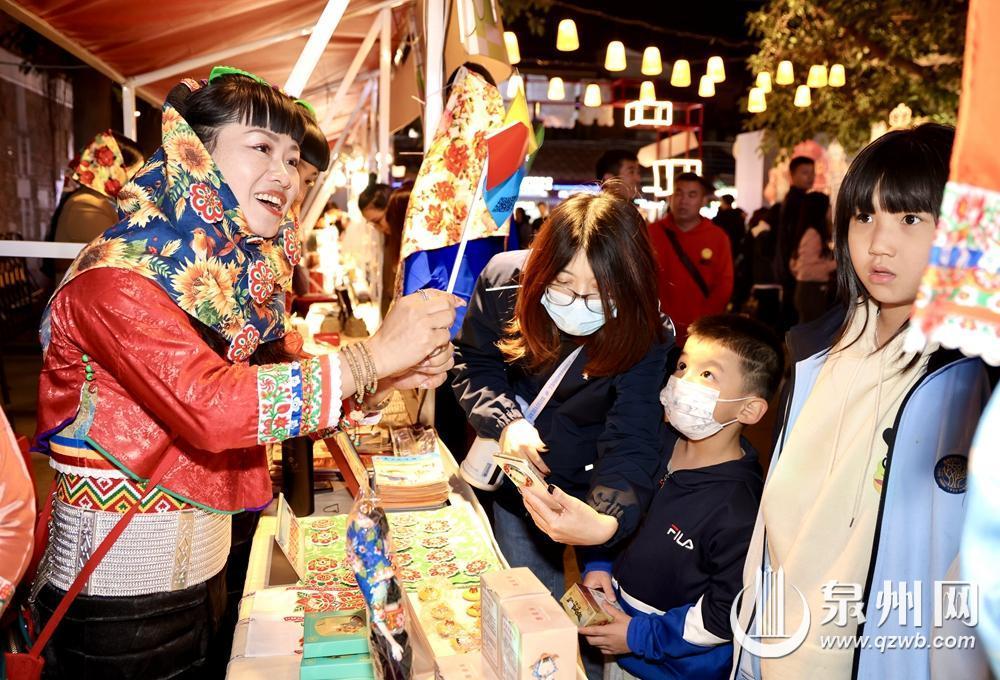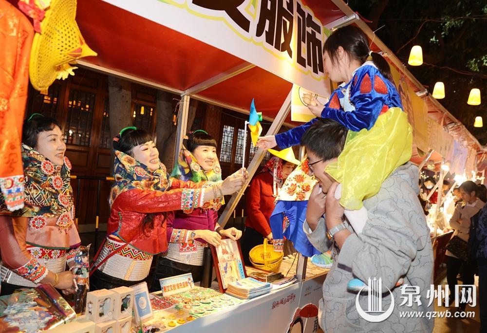 11月24日晚,在泉州古城西街肃清门广场,盛装的惠女向市民、游客介绍文创产品。 (彭燕珍 摄)