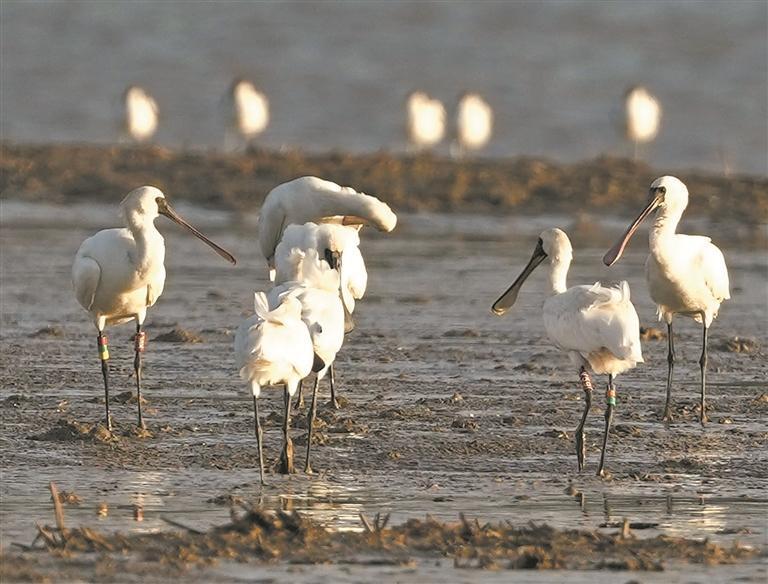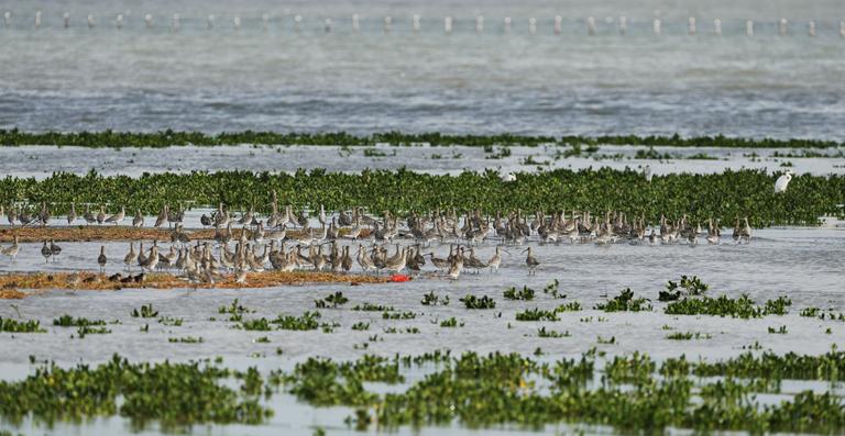 除了壮观的“鸟浪”,监测人员还观测到不少国家一级保护动物黑嘴鸥和黑脸琵鹭。其中,监测到的黑脸琵鹭有20多只。“今天监测到的黑嘴鸥有200多只,比前几天多了不少。”昨日,郑榕凯再次到水头外线,还监测到300多只国家二级保护动物白腰杓鹬。