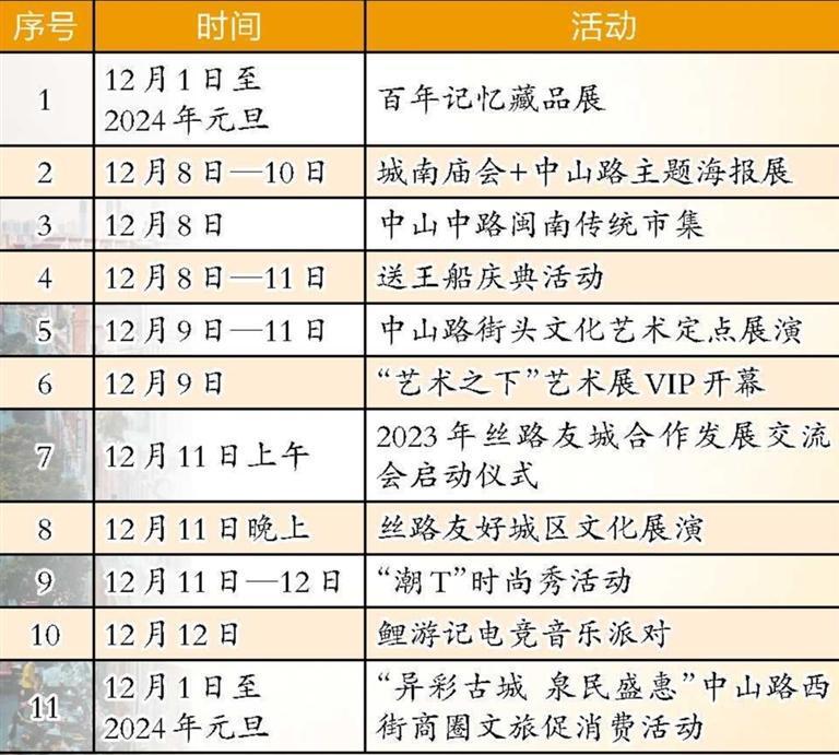 今年12月,鲤城区委区政府将举办泉州中山路商业街百年庆典暨2023年“丝路友城”合作发展交流会,策划推出“8个一”,即一场展览、一场庙会、一场文商旅促消费活动、一场电竞音乐嘉年华、一场“潮T”时尚秀、一场街头艺术展演、一场文化交融活动和一个互动话题等,展现中山路百年芳华,持续激发市场活力,营造全场景、全业态、更具“烟火气”的商业街区氛围。