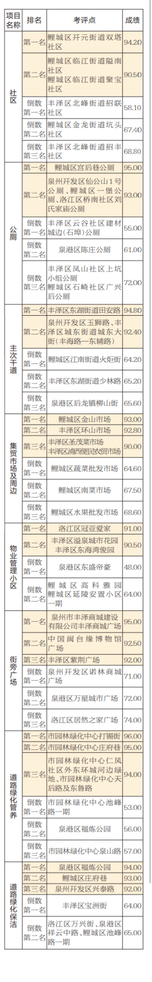 10月份,市城管局考评中心共抽评63个社区、82条主次干道、110个住宅小区、26个街旁广场、53条内沟河、6条江岸带、34座市场、84座公厕、55条道路绿化、215个二次供水单位、12座公园、3个城建PPP项目,共发现问题7408处。各区综合考评成绩如下:洛江区84.38分,泉州开发区84.18分,鲤城区83.45分,泉港区82.70分,丰泽区82.42分。