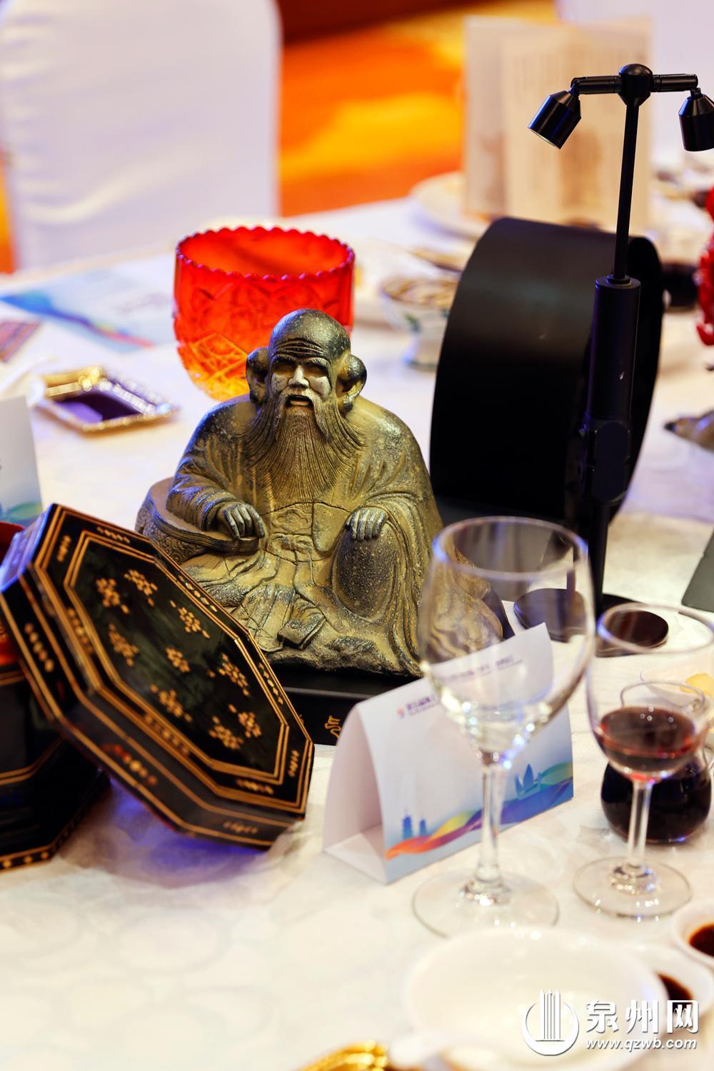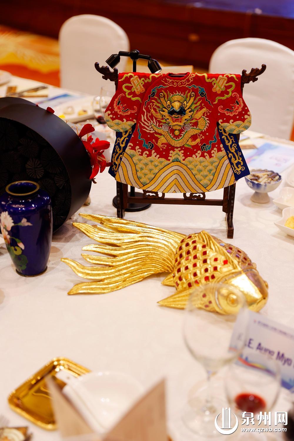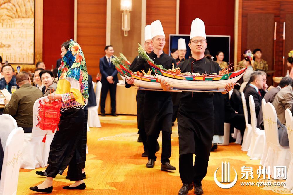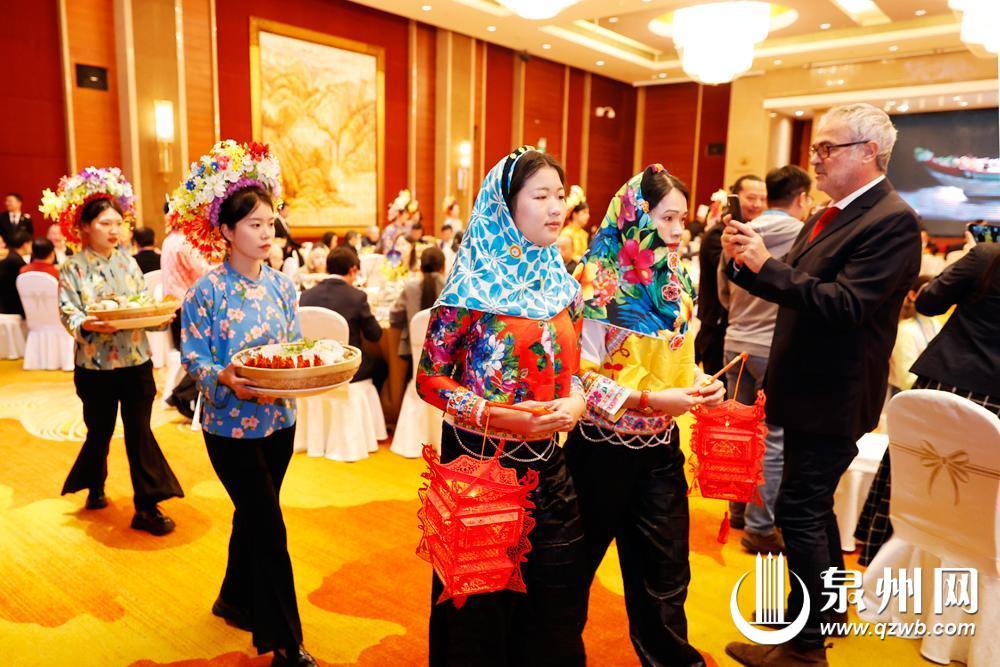 身着蟳埔女、惠安女服饰的服务员呈上特色菜肴,欢迎晚宴上满满泉州元素。