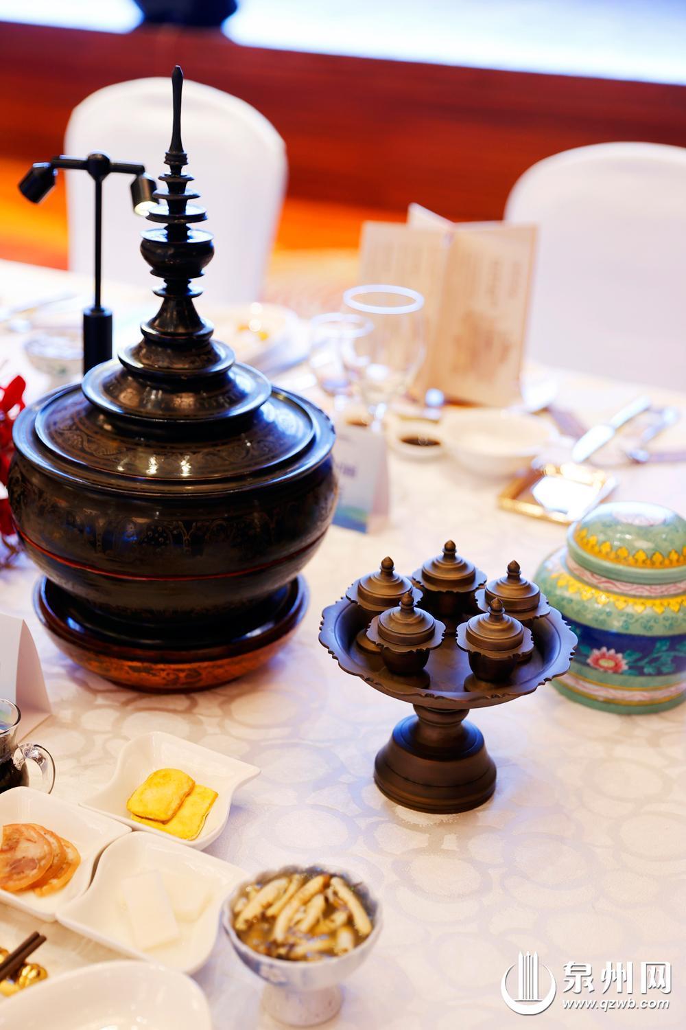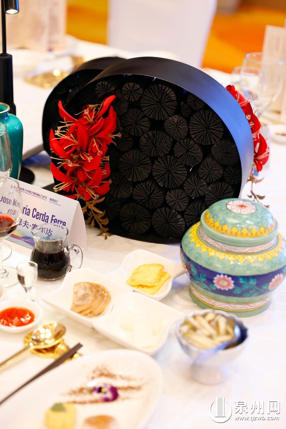 与此同时,泉籍漆画艺术家陈立德的漆画作品《市井十洲人》作为视觉基调,融入晚宴菜单、餐盘、餐巾、茶礼等宴席器物中,让宾客们仿若穿越回“涨海声中万国商”的宋元泉州,以艺术的视角开启一场味蕾之旅。