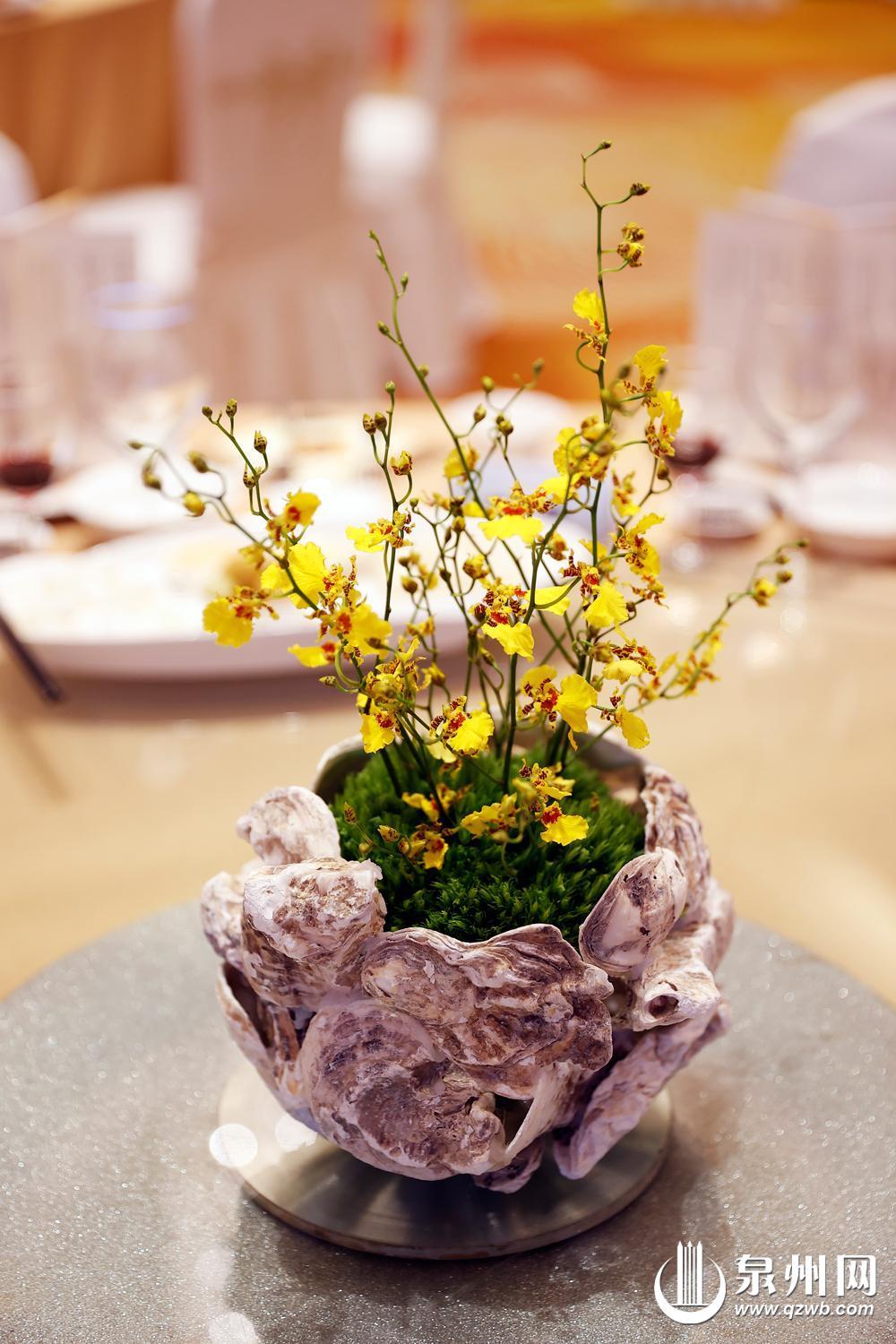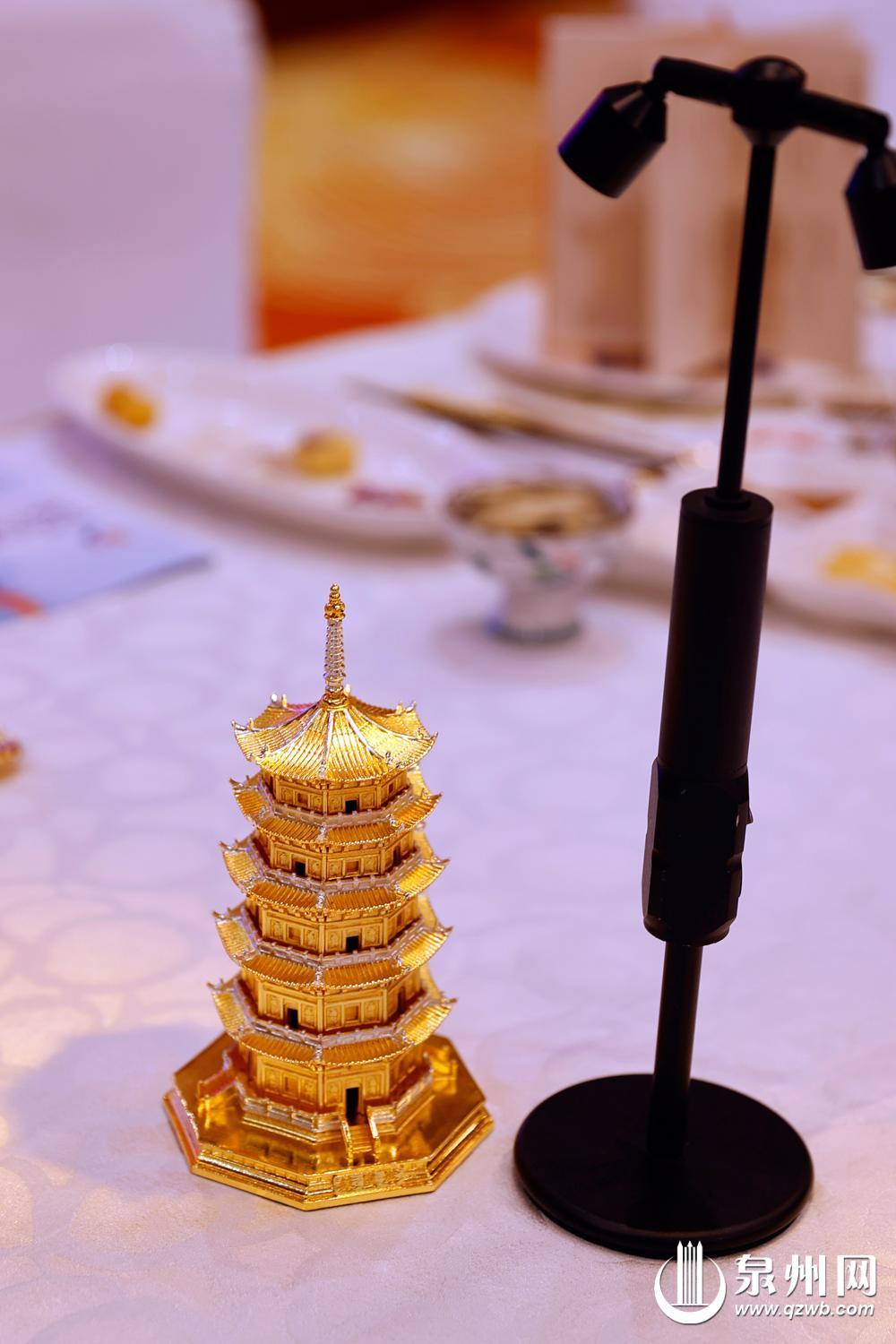 满载着海鲜“福船”、盛放着闽南经典炸物的永春漆篮、沁着铁观音清香的德化白瓷茶杯、浓缩版的“东西塔”……晚宴现场,包括闽南砖雕、安溪竹编、金苍绣、锡雕、滴水兽等在内的泉州非遗元素令人目不暇接,以场景设计的形式串联起泉州的世遗文化、市井烟火和当代艺术之美。