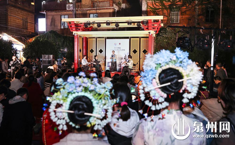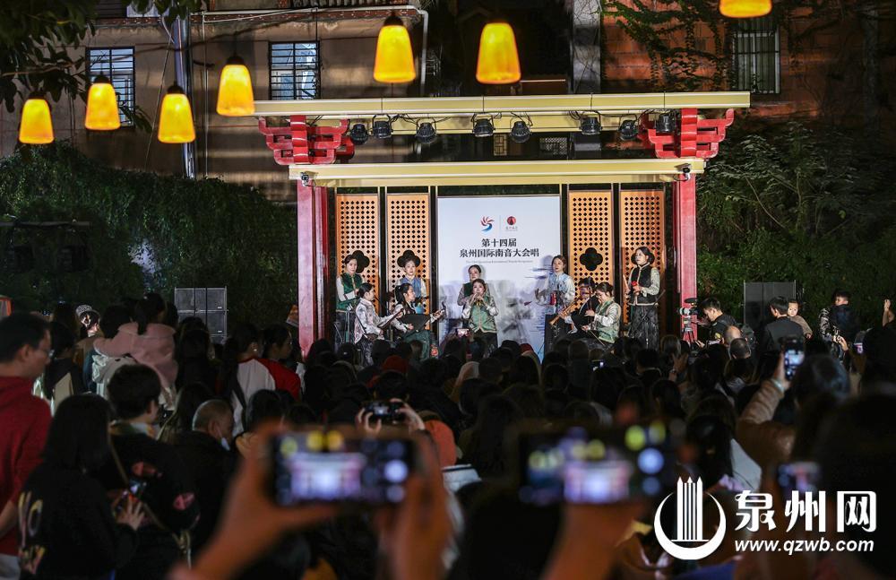 8日晚19时许,第十四届泉州国际南音大会唱展演在肃清门举行。