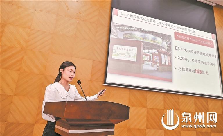 紧随其后,来自黎明职业大学青苗理论宣讲团的廖馨颖以《于“万亿时代”的“世遗之城”》为题,娓娓讲述泉州在调和物质富足和精神富足上的种种做法,引出“中国式现代化是物质文明和精神文明相协调的现代化”这一理论,只有不断厚植现代化的物质基础,大力发展社会主义先进文化,传承中华文明,才能达到物的全面丰富和人的全面发展相统一。