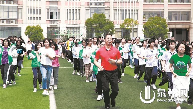 泉州五中的老师带着学生在课间跑操