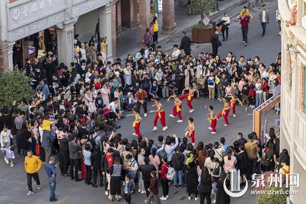 中山路传统民俗“拍胸舞”表演,吸引众多市民游客前来打卡。(王沧海 摄)