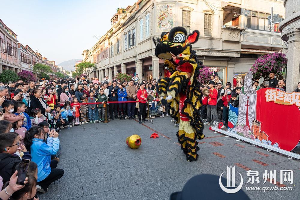 中山路街头上演非遗文化舞狮表演,内容精彩,生动有趣,深受市民游客喜爱。(何国辉 摄)