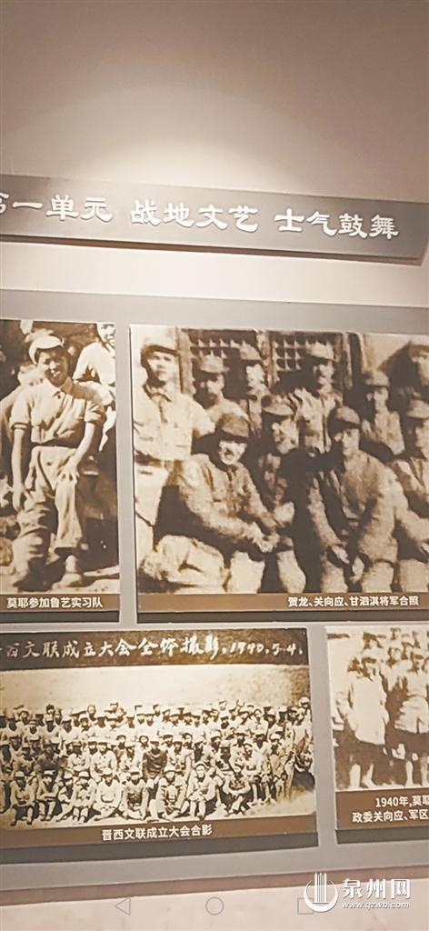 莫耶故居里,墙上照片反映莫耶在部队通过文艺鼓舞士气的事迹。