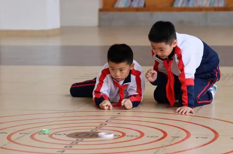 至和大厅可是我们另一处欢乐世界。你们瞧,这是跳格子,双脚跳着,蹦着,好开心啊。“石头剪刀布!”,你赢了,你先走,这是我们的“交通规则游戏区”,同学们可要遵守数字框中的规则,才能顺利前行哦!这是沙包投准,一环又一环,投中10分,收获的掌声可不小!同学们还创新了不少玩法:拿象棋子当做“冰壶”,手指一弹,比试准度,同样有趣!