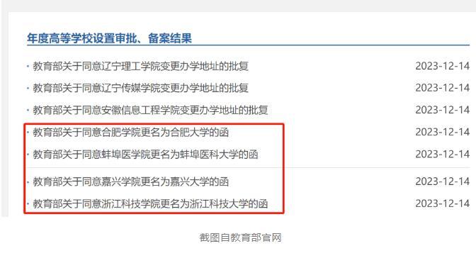 近日,教育部官网发文,同意合肥学院更名为合肥大学、蚌埠医学院更名为蚌埠医科大学、嘉兴学院更名为嘉兴大学、浙江科技学院更名为浙江科技大学。