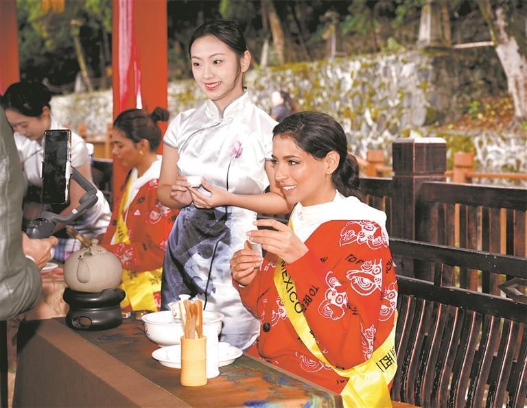 16日上午,另一组世界旅游小姐相聚安溪,她们沿着清水岩精品文化旅游线路进行深度采风体验。在每个景点,工作人员都会向她们介绍特色景点和历史文化,还邀请她们一同品尝铁观音和柿饼、桔红糕等特色小吃。佳丽们也不忘和游客互动,分享自己的旅游经历和感受。“安溪的美食非常有特色,尤其是安溪的柿饼和桔红糕,味道非常好。我会推荐给朋友们,让他们也来尝尝这独特的味道。”来自新西兰的Britney Pringle对安溪特色小吃赞不绝口。