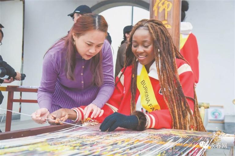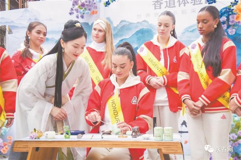 18日上午,31位来自世界各地的佳丽抵达永春五里古街,开启采风之旅。漫步在五里古街,佳丽们开心地品尝了永春芦柑、醋冰淇淋和当地名优特产,沿途参观特色建筑之余,还体验了一把非遗纸织画,观赏了茶道、香道表演,并在老师的指导下浅学了永春白鹤拳基本功。