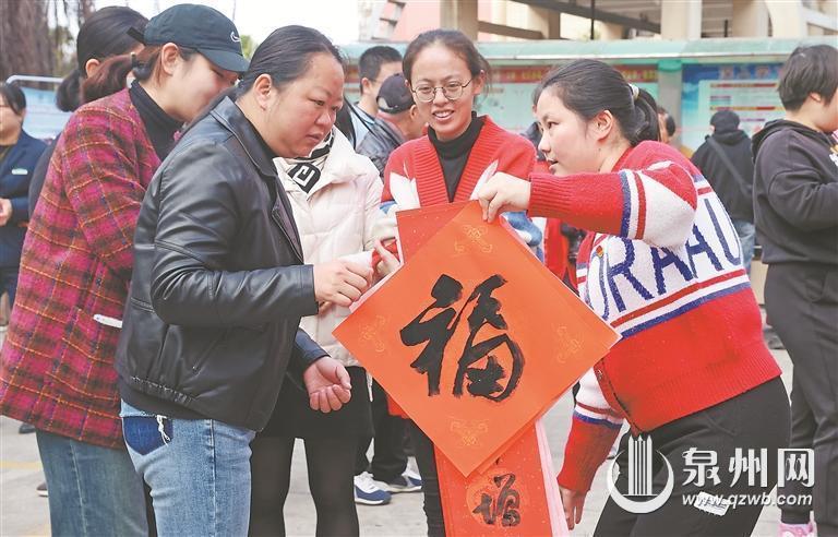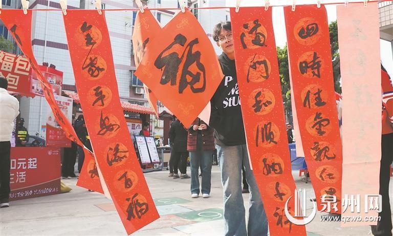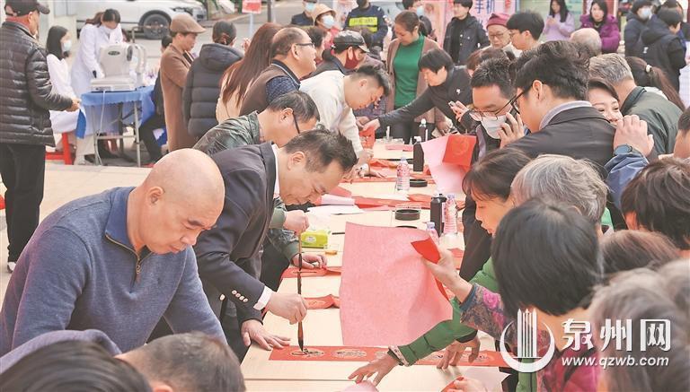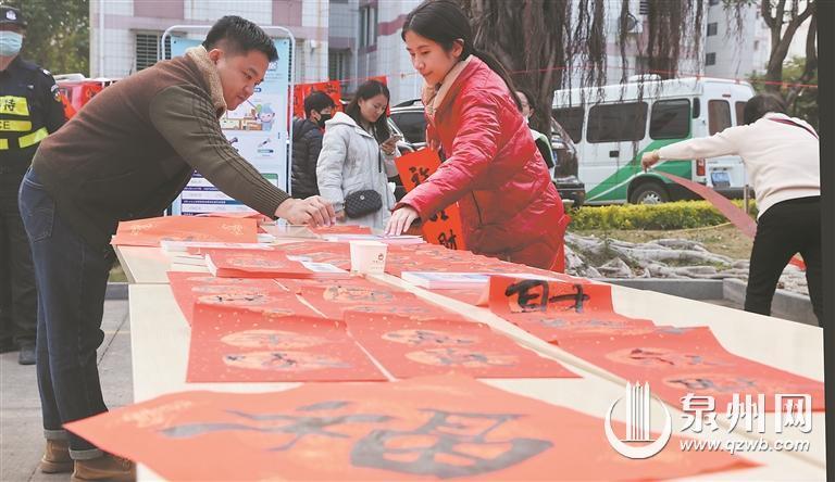 “东风喜报开心事,南燕衔来满眼春”“迎新春江山锦绣,辞旧岁事泰辉煌”……活动现场,泉州市书法家协会的书法家们一字排开,接过群众手里的洒金红宣后,开始挥毫泼墨、激情书写,不一会儿,一副副散发淡淡墨香、寓意吉祥的对联、一个个饱含神韵的“福”字跃然纸上。市民们接过春联,脸上洋溢着灿烂的笑容。